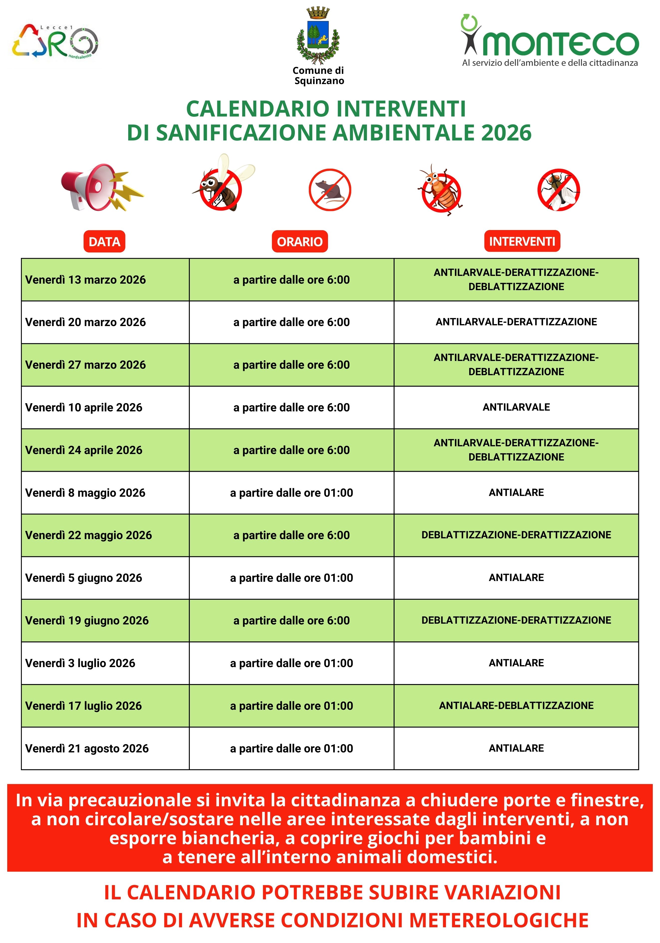 Per le date indicate nel calendario di INTERVENTI DI SANIFICAZIONE AMBIENTALE 2026, si invita tutta la cittadinanza del  Comune di Squinzano 𝗮 𝗰𝗵𝗶𝘂𝗱𝗲𝗿𝗲 𝗽𝗼𝗿𝘁𝗲 𝗲 𝗳𝗶𝗻𝗲𝘀𝘁𝗿𝗲, 𝗮 𝗻𝗼𝗻 𝗰𝗶𝗿𝗰𝗼𝗹𝗮𝗿𝗲/𝘀𝗼𝘀𝘁𝗮𝗿𝗲 𝗻𝗲𝗹𝗹𝗲 𝗮𝗿𝗲𝗲 𝗶𝗻𝘁𝗲𝗿𝗲𝘀𝘀𝗮𝘁𝗲 𝗱𝗮𝗴𝗹𝗶 𝗶𝗻𝘁𝗲𝗿𝘃𝗲𝗻𝘁𝗶, 𝗮 𝗻𝗼𝗻 𝗲𝘀𝗽𝗼𝗿𝗿𝗲 𝗯𝗶𝗮𝗻𝗰𝗵𝗲𝗿𝗶𝗮, 𝗮 𝗰𝗼𝗽𝗿𝗶𝗿𝗲 𝗴𝗶𝗼𝗰𝗵𝗶 𝗽𝗲𝗿 𝗯𝗮𝗺𝗯𝗶𝗻𝗶 𝗲 𝗮 𝘁𝗲𝗻𝗲𝗿𝗲 𝗮𝗹𝗹'𝗶𝗻𝘁𝗲𝗿𝗻𝗼 𝗮𝗻𝗶𝗺𝗮𝗹𝗶 𝗱𝗼𝗺𝗲𝘀𝘁𝗶𝗰𝗶.