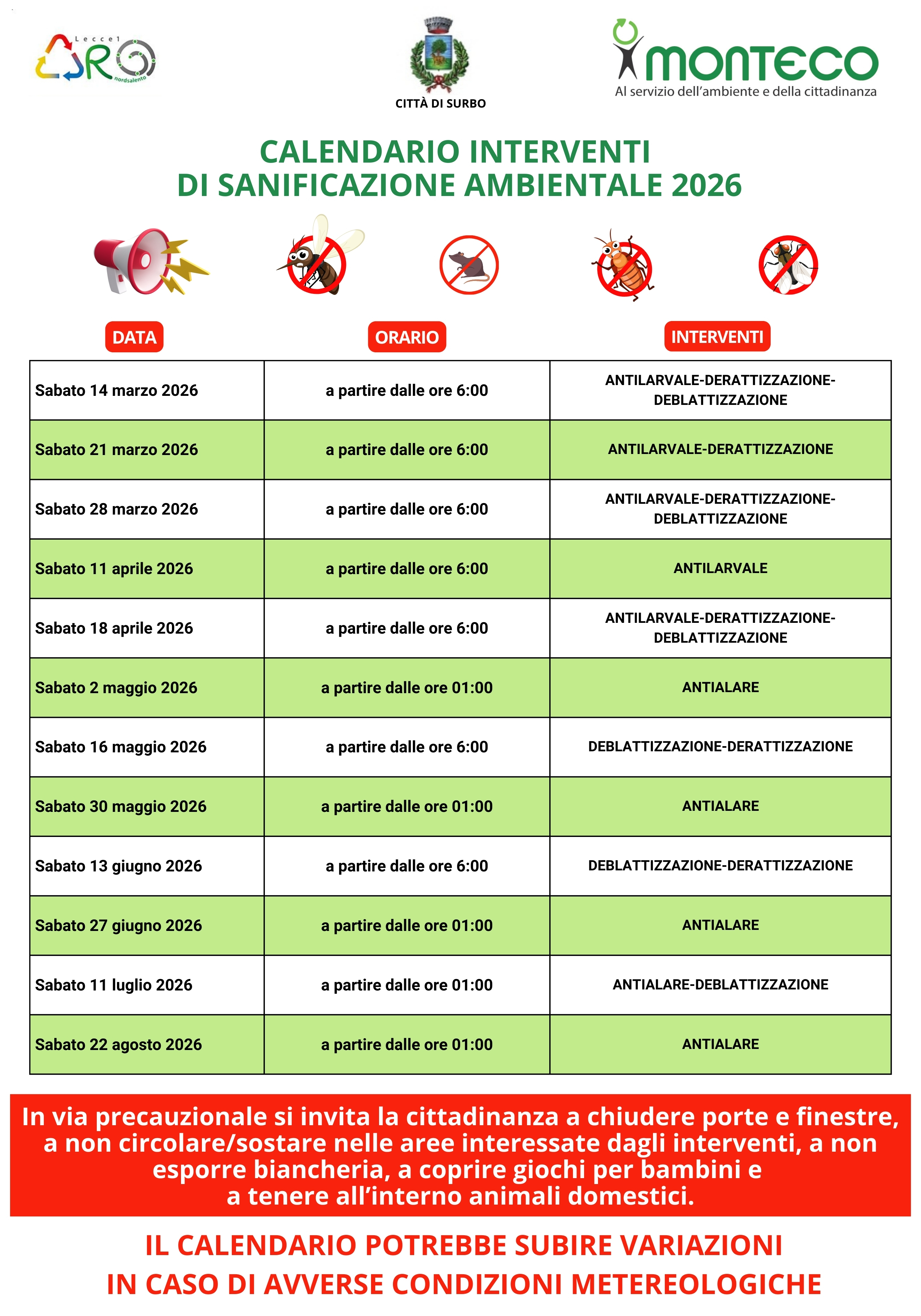 Per le date indicate nel calendario di INTERVENTI DI SANIFICAZIONE AMBIENTALE 2026, si invita tutta la cittadinanza del  Comune di Surbo 𝗮 𝗰𝗵𝗶𝘂𝗱𝗲𝗿𝗲 𝗽𝗼𝗿𝘁𝗲 𝗲 𝗳𝗶𝗻𝗲𝘀𝘁𝗿𝗲, 𝗮 𝗻𝗼𝗻 𝗰𝗶𝗿𝗰𝗼𝗹𝗮𝗿𝗲/𝘀𝗼𝘀𝘁𝗮𝗿𝗲 𝗻𝗲𝗹𝗹𝗲 𝗮𝗿𝗲𝗲 𝗶𝗻𝘁𝗲𝗿𝗲𝘀𝘀𝗮𝘁𝗲 𝗱𝗮𝗴𝗹𝗶 𝗶𝗻𝘁𝗲𝗿𝘃𝗲𝗻𝘁𝗶, 𝗮 𝗻𝗼𝗻 𝗲𝘀𝗽𝗼𝗿𝗿𝗲 𝗯𝗶𝗮𝗻𝗰𝗵𝗲𝗿𝗶𝗮, 𝗮 𝗰𝗼𝗽𝗿𝗶𝗿𝗲 𝗴𝗶𝗼𝗰𝗵𝗶 𝗽𝗲𝗿 𝗯𝗮𝗺𝗯𝗶𝗻𝗶 𝗲 𝗮 𝘁𝗲𝗻𝗲𝗿𝗲 𝗮𝗹𝗹'𝗶𝗻𝘁𝗲𝗿𝗻𝗼 𝗮𝗻𝗶𝗺𝗮𝗹𝗶 𝗱𝗼𝗺𝗲𝘀𝘁𝗶𝗰𝗶.